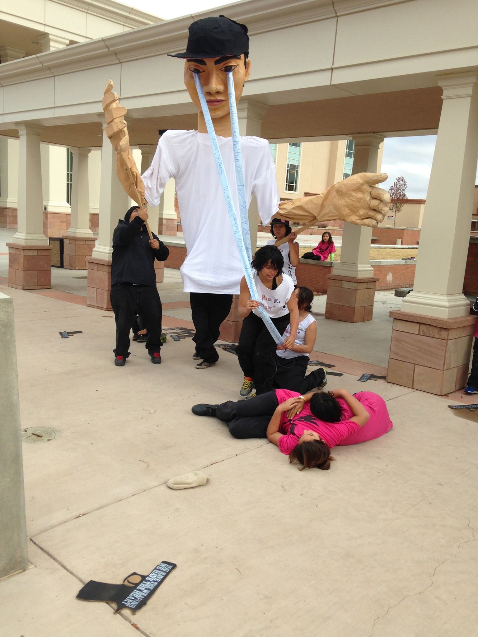 The art intervention was to protest specifically the recent grand jury decision of ‘justifiable homicide’ in the case of Española, New Mexico Police Officer Jeremy Apodaca killing sixteen year old Victor Villalpando on June 8, 2014. Artists created expressions through physical theatre, dance, poetry, spoken word, cardboard-based art and puppetry.