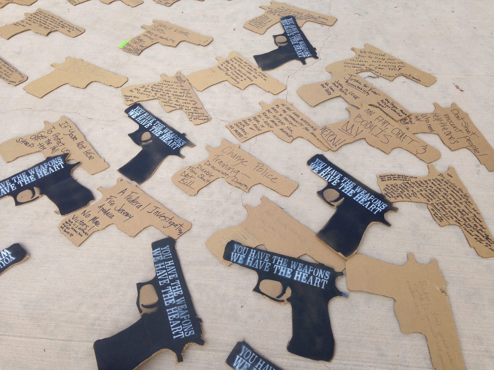 Cardboard cut out guns with messages for the police, at an art intervention in Santa Fe, organized by Concerned Citizens for Community Safety, 22 October 2014 – in conjunction with a National Day of Protest to STOP police brutality, Repression and the Criminalization of a Generation.